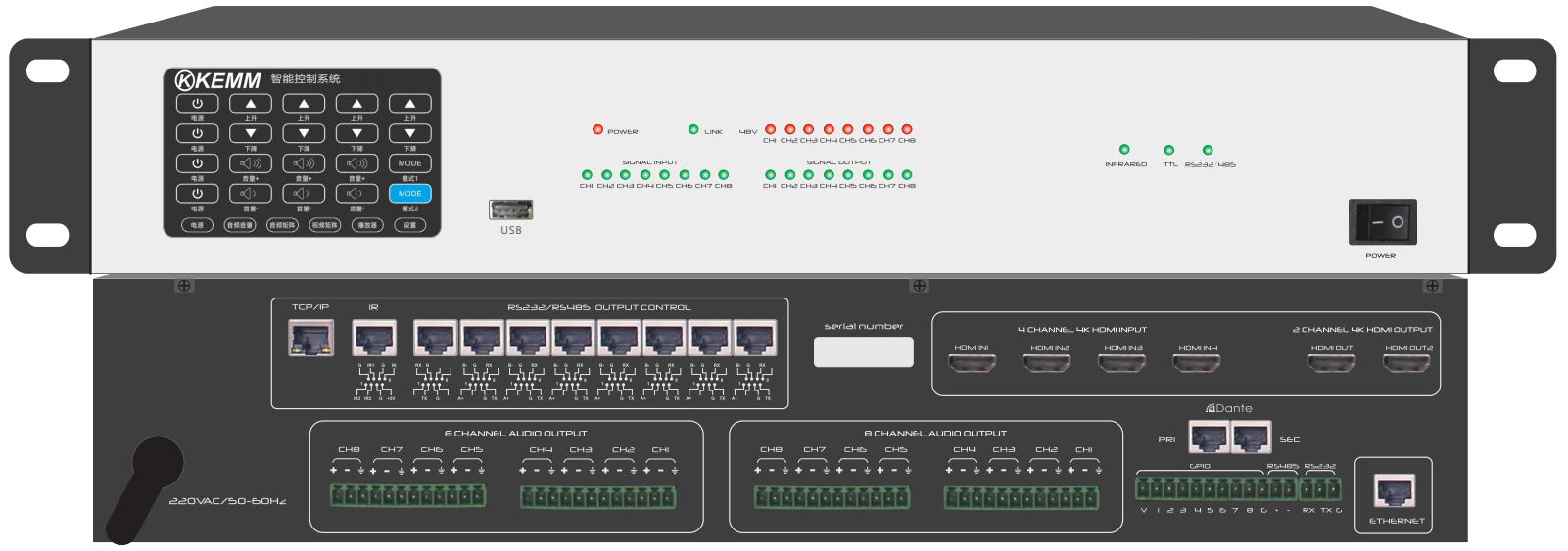 支持100M以太網(wǎng)TCP/UDP/TTL控制,7路RS232/RS485控制,3路紅外控制,1路TTL