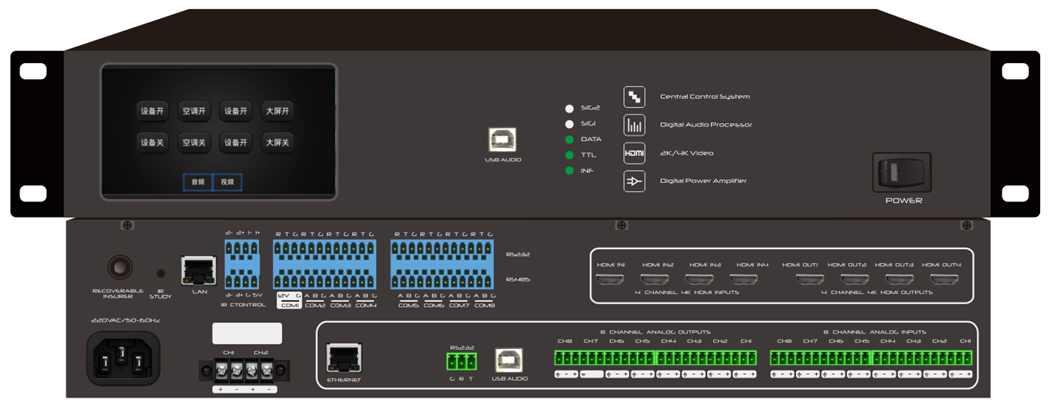 1、面板支持4.3寸觸摸屏,通過屏幕控制可實現(xiàn)對空調(diào)、音頻、視頻、大屏、投影機等設(shè)備的開啟和關(guān)閉