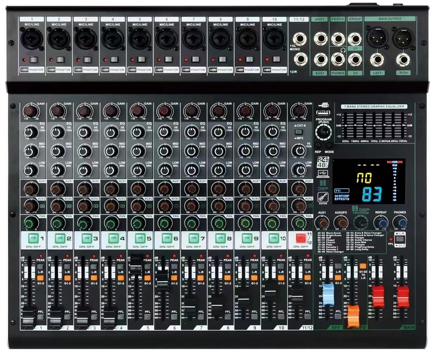 ●內(nèi)置48V幻想電源供電,每通道帶獨(dú)立開關(guān),主輸出7段均衡器,USB可與一路立體聲切換,USB可獨(dú)立調(diào)節(jié),MP3可與一路立體聲切換,MP3可獨(dú)立調(diào)節(jié)